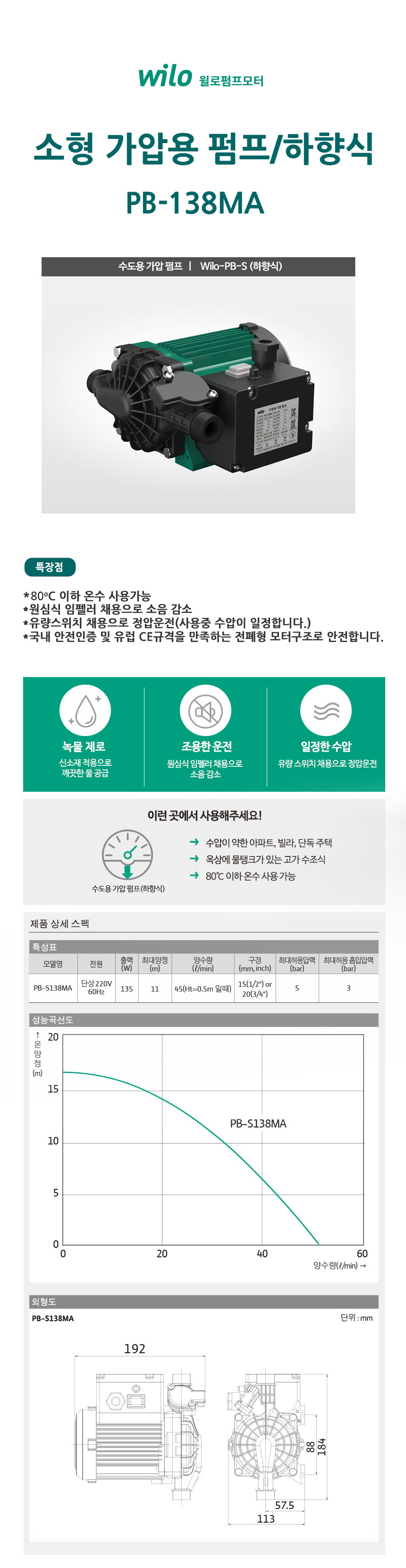 윌로 소형 하향식 수도용 가압펌프 PB-138MA